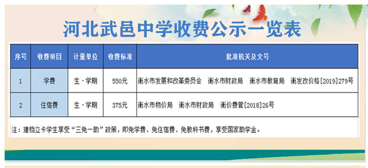 河北武邑中学收费公示一览表