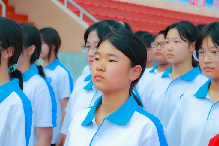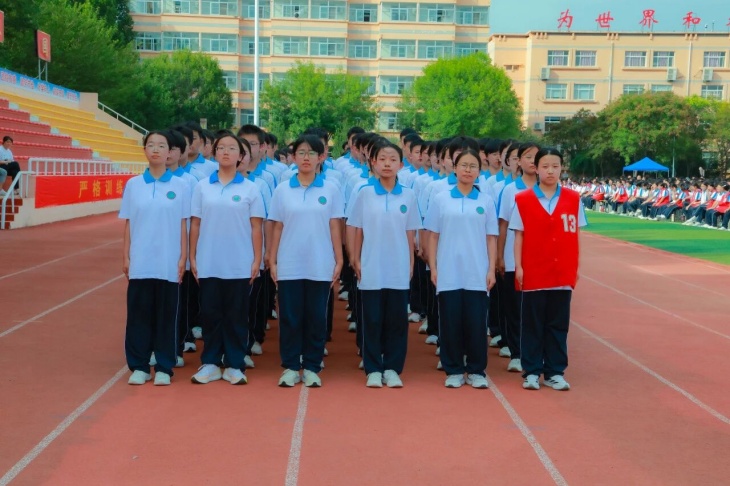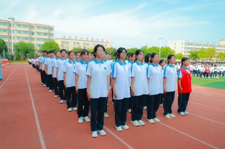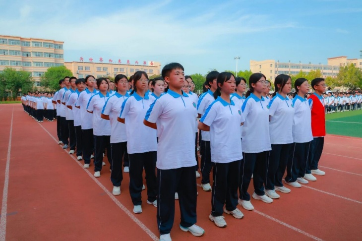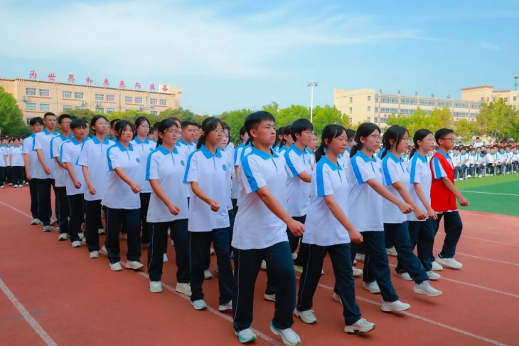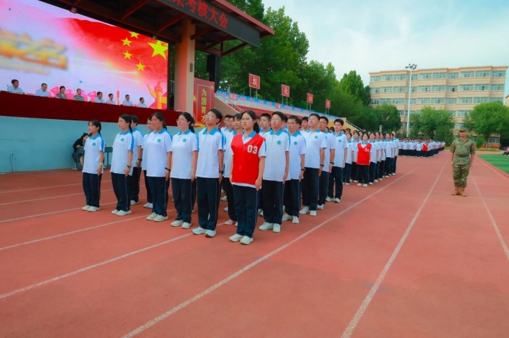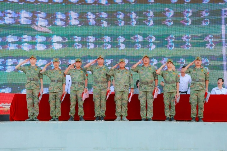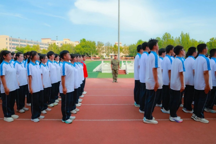 淬火成钢展英姿,青春砺剑启新程。在为期七天的军事训练中,高一新生以汗水浇灌成长,用意志对抗骄阳,以昂扬的斗志和整齐的步伐,成功迈出了高中生涯坚实的第一步。为检验武中学子的军训成果,展现新生蓬勃的军训风采,并进一步激发同学们爱国爱党爱军的炽热情怀,9月7日下午,武邑中学2025级新生军训成果考核大会在操场举行。武邑县人民武装部部长韩重建,武邑中学党委副书记、副校长赵杰翔,武邑中学副校长赵晓艳、金耀辉、高智勇,安全处主任魏红胜,高一年级主任孙涛、贾新亮,以及全体高一师生参加了此次大会。