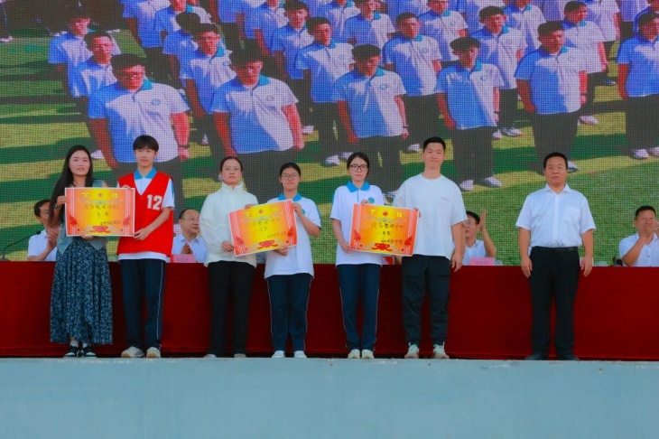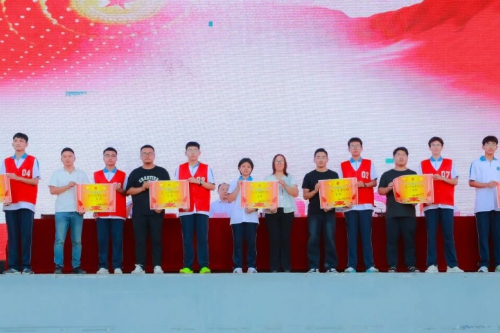 最令人心潮澎湃、倍感荣耀的,当属激动人心的颁奖环节!我校领导分别为军训宿舍内务整理优秀班集体、军训成果考核优秀班集体、军训优秀教官颁发奖品奖状。