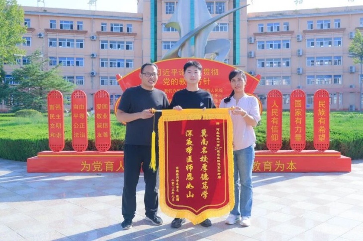 “师者,所以传道授业解惑也。”然而,在武邑中学,老师的角色远不止于此。对于2417班的班主任马高阳老师而言,守护每一位学生的安全与健康,是他肩上最沉甸甸的责任。不久前,宋懿晗同学因不慎食用坚果,突发严重过敏反应。情况危急,学生的安危牵动着所有人的心。在这千钧一发的时刻,马高阳老师没有丝毫犹豫,他沉着冷静,第一时间做出判断,迅速将宋同学送往医院。从联系家长、办理手续到全程陪护,他忙前忙后,用最迅速的行动和最温暖的陪伴,为学生争取到了最宝贵的救治时间。当看到宋同学转危为安,马老师悬着的心才终于放下。一面写有“冀南名校厚德笃学 深夜带医师恩如山”的锦旗,是家长最真挚的感谢,也是对马老师临危不乱、爱生如子精神的最高褒奖。