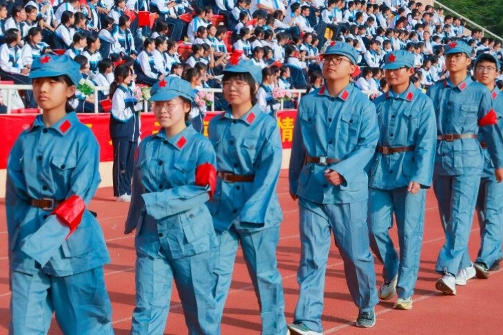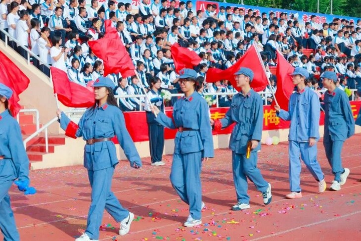 国旗护卫队率先引领着校旗队、彩旗方阵、花束方阵以及裁判员队伍行进过观礼台,展现出武中人的蓬勃朝气和坚定信念。他们神情肃穆,气宇轩昂,引领着队伍前进的方向。