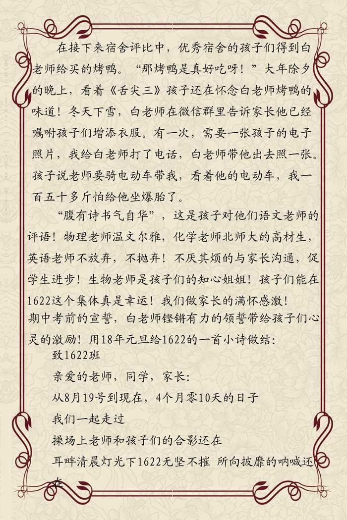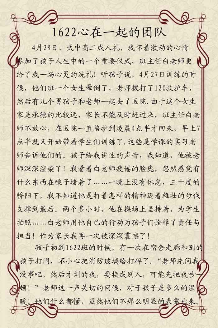 家长在信中详细阐述了白露老师为孩子做的点点滴滴,每一件事都让家长感动又感激。成人礼前夕,学生生病住院,家长由于路途遥远来不了,白露老师在医院陪护到凌晨四点半,直到家长到来才回家。之后又在早晨7点半和孩子们一起训练。白露老师还会经常和家长沟通孩子的在校情况,对孩子关怀备至,他的这一行为使家长们对孩子更加放心,也更加感动。对于1622班的任课老师,家长也是十分赞扬,言辞话语之间充满着对老师们辛勤培育孩子的感激之情和对老师们尽职尽责的敬佩之意。