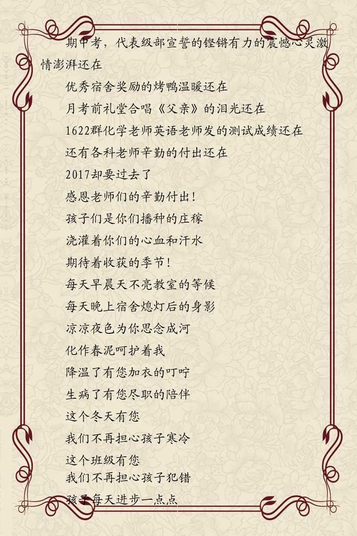 日前,家长送来感谢信表达对1622班班主任白露老师以及1622班全体教师的感激之情,他们为孩子能在1622班求学而倍感幸运。