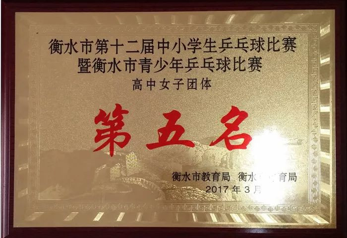 衡水市青少年乒乓球比赛女子团体第五名