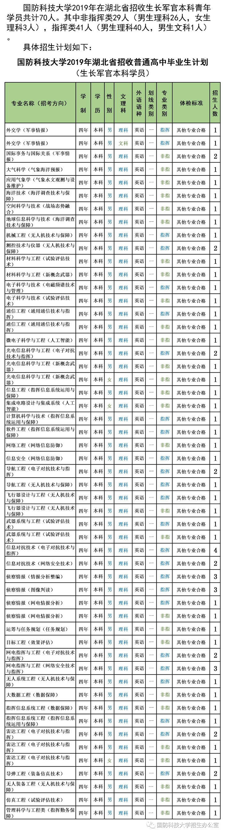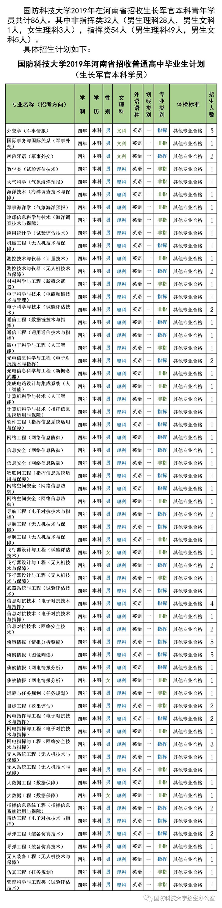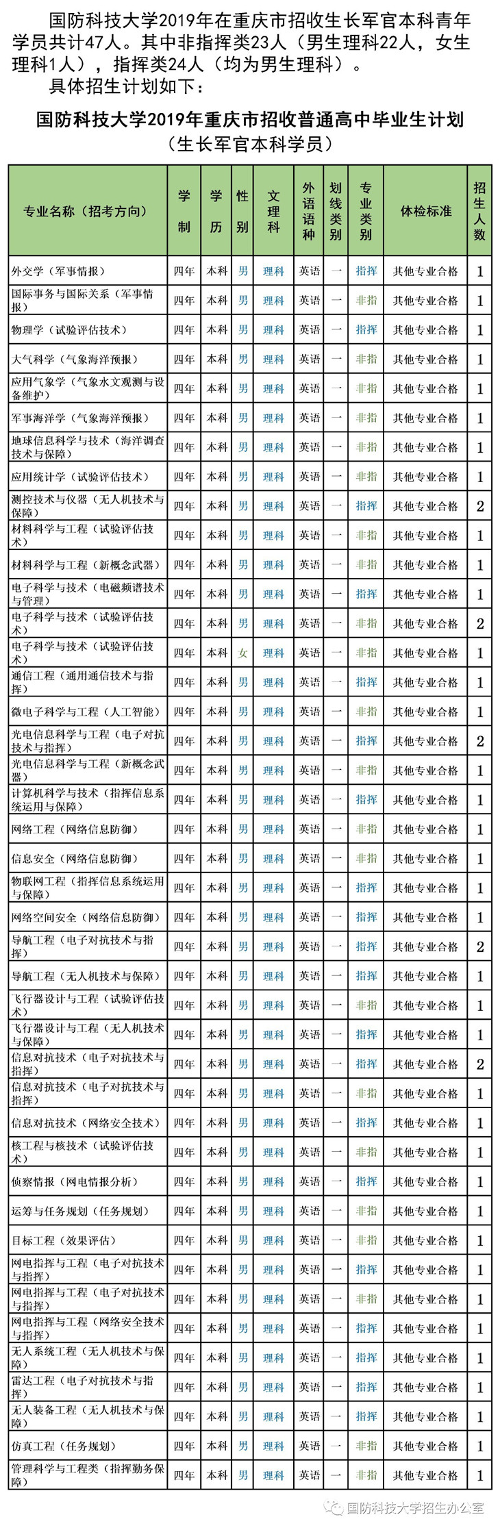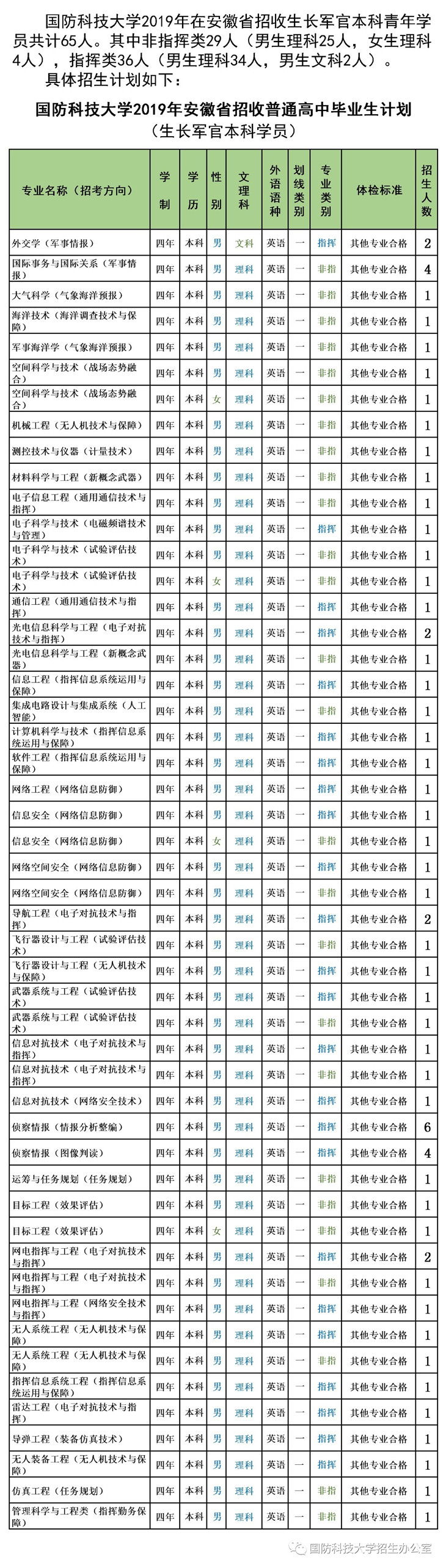 国防科技大学2019年招收普通高中毕业生计划(生长军官本科学员)