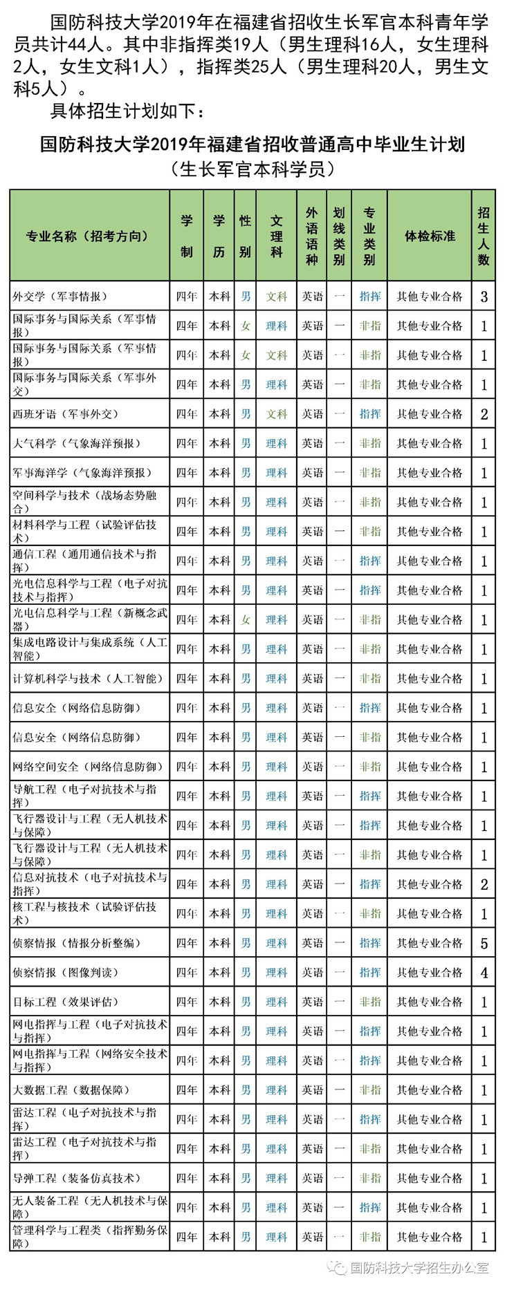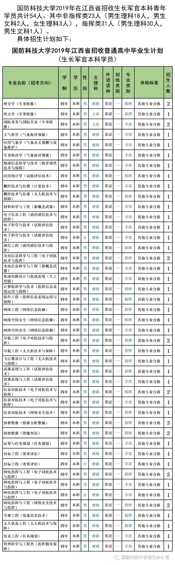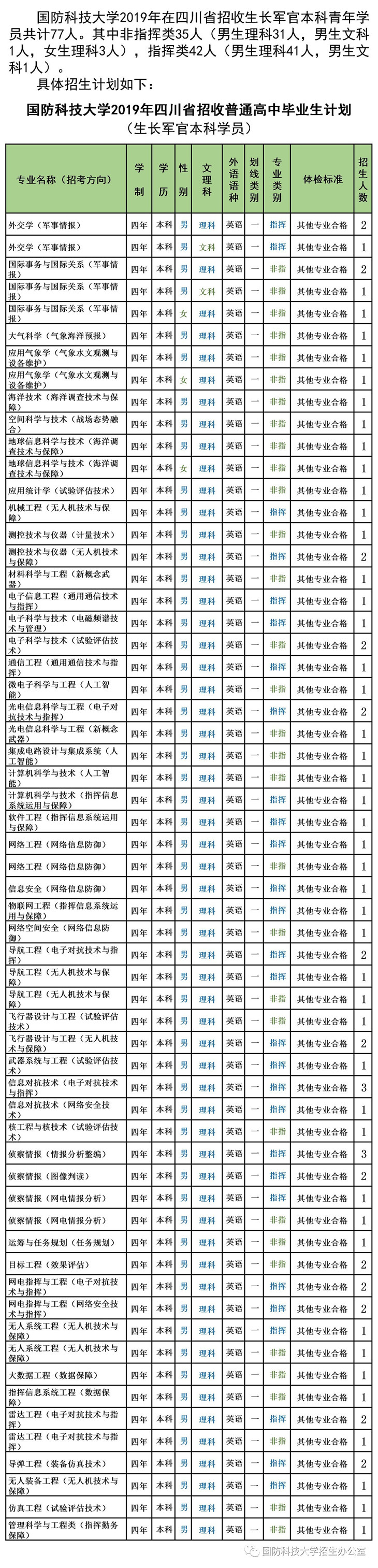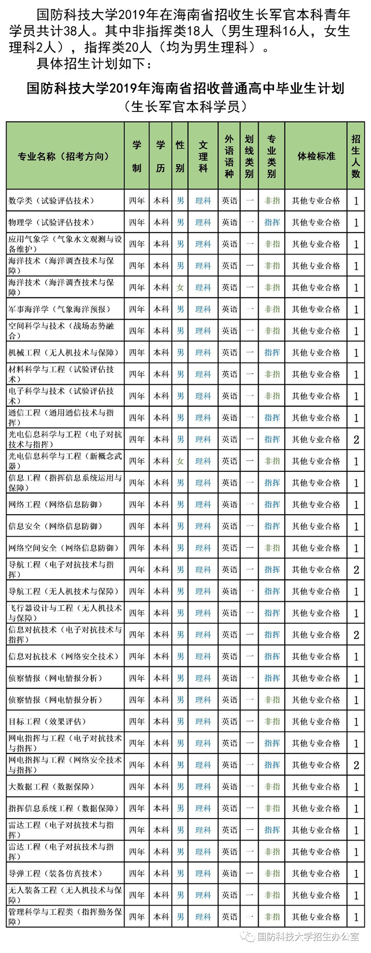 国防科技大学2019年招收普通高中毕业生计划(生长军官本科学员)