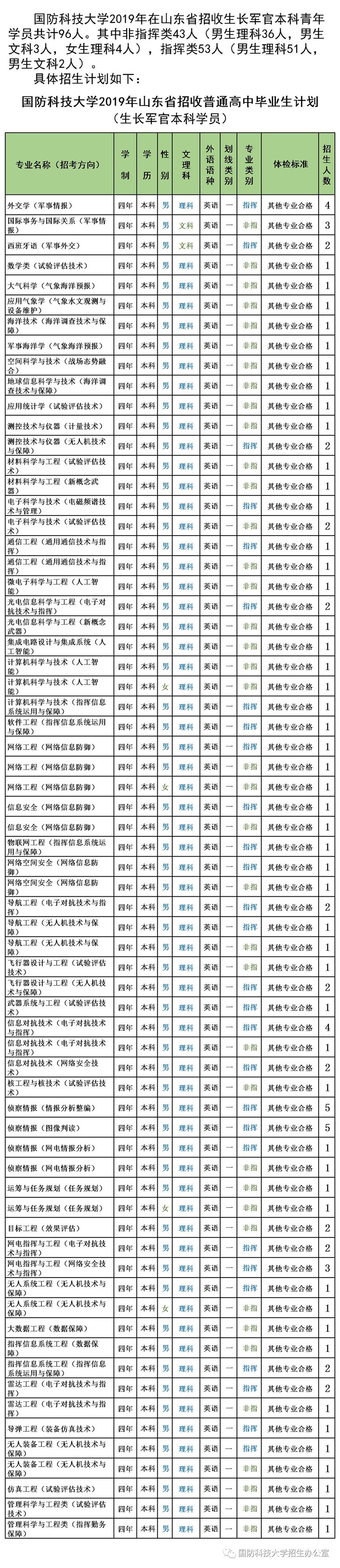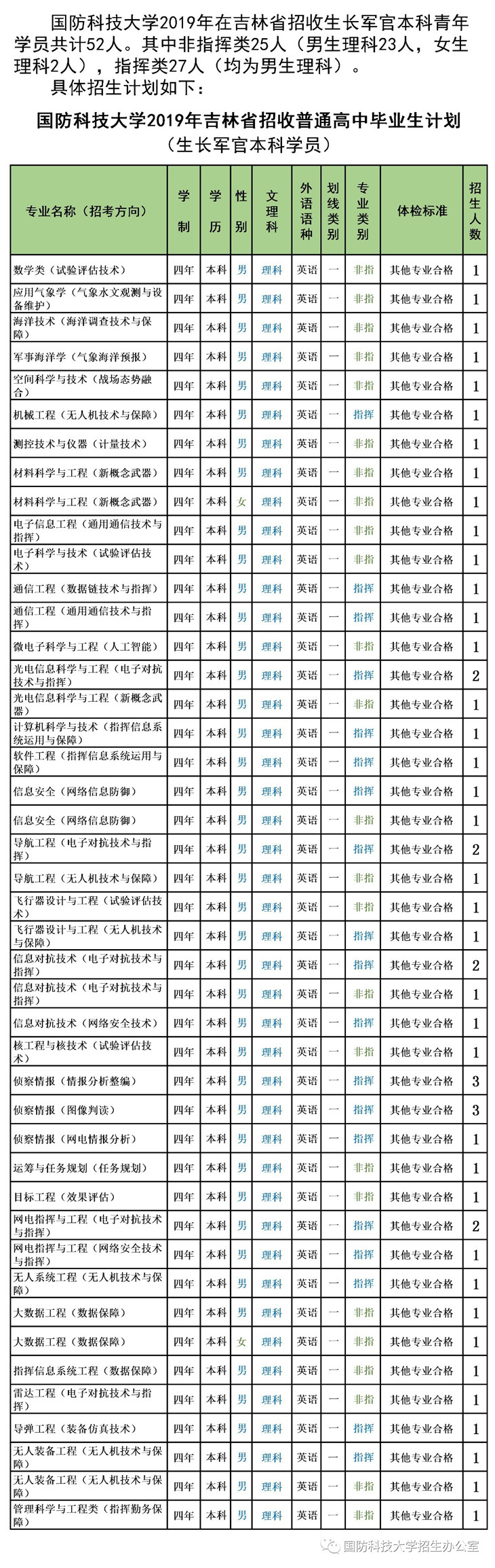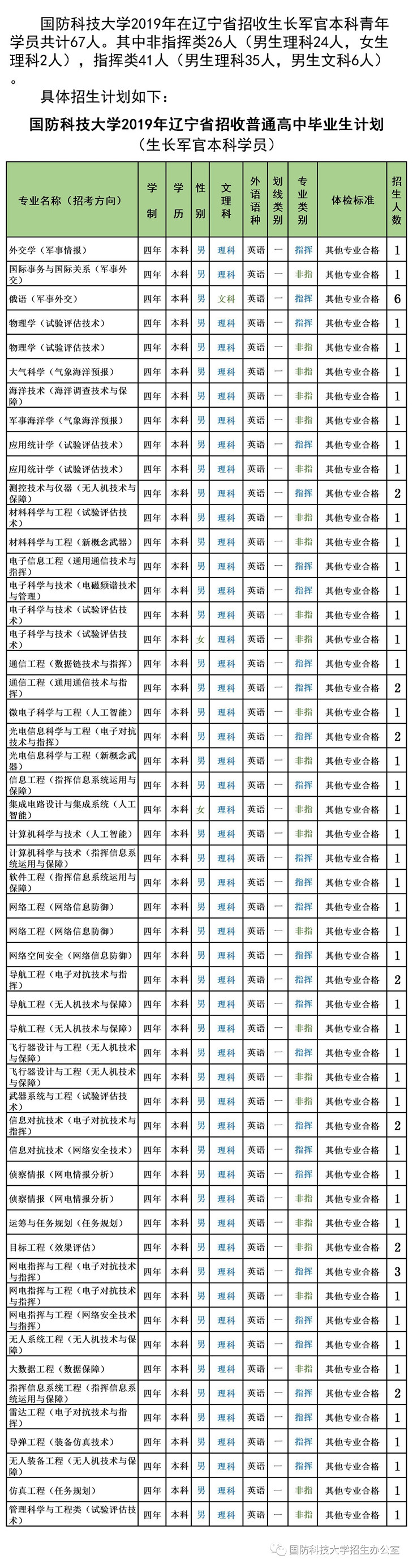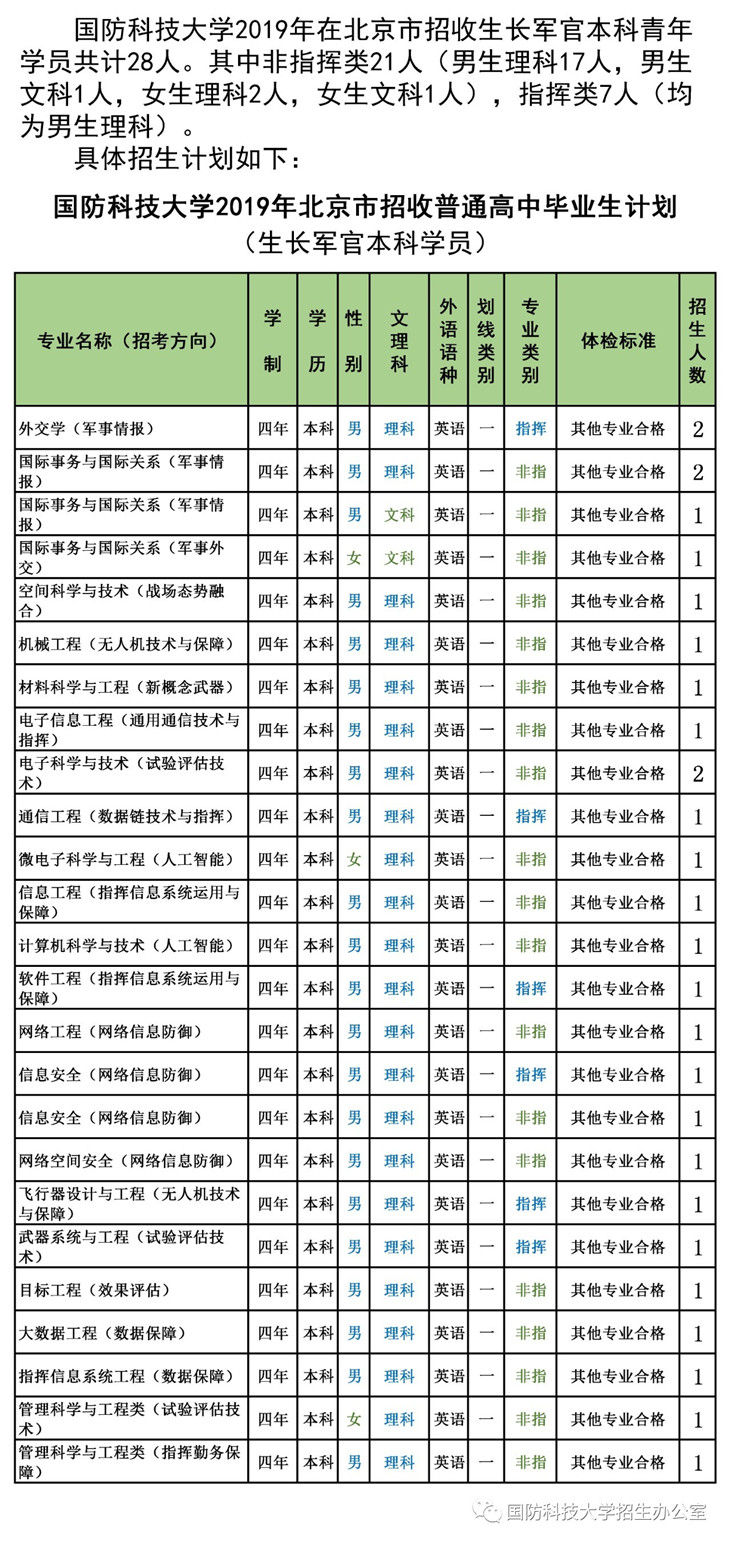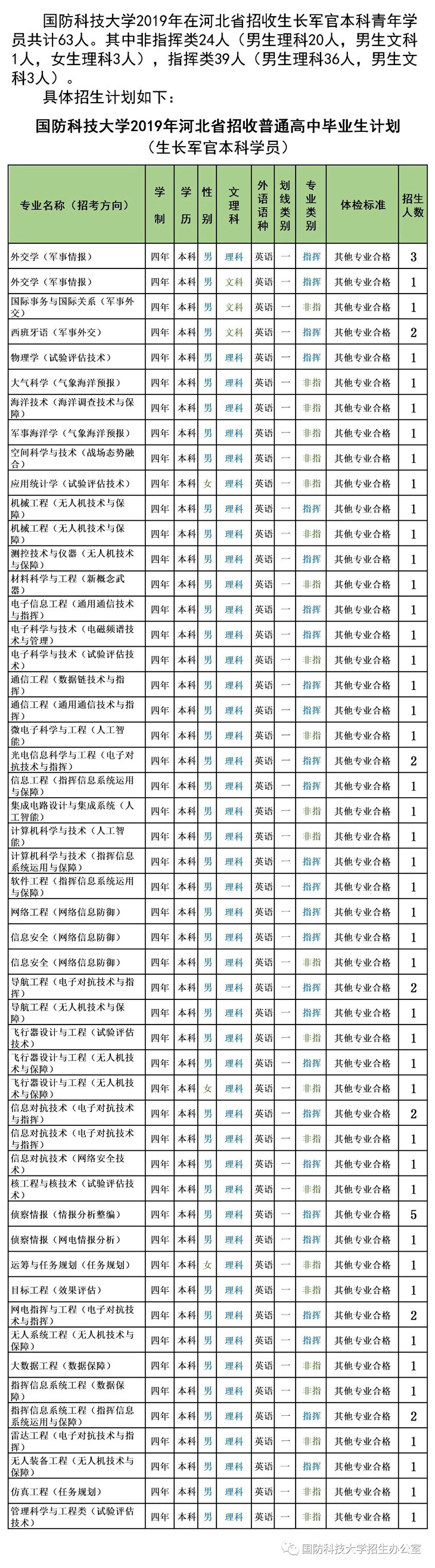 国防科技大学2019年招收普通高中毕业生计划(生长军官本科学员)