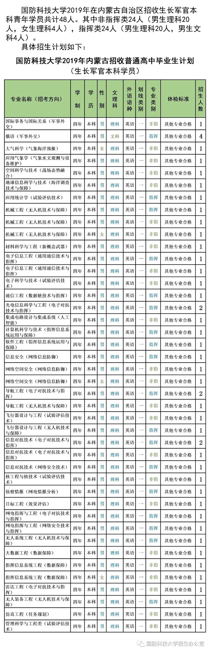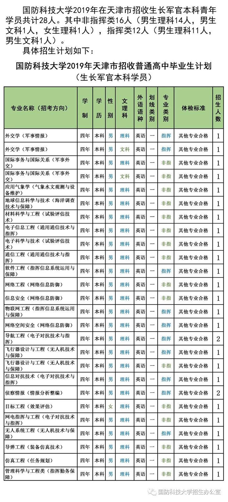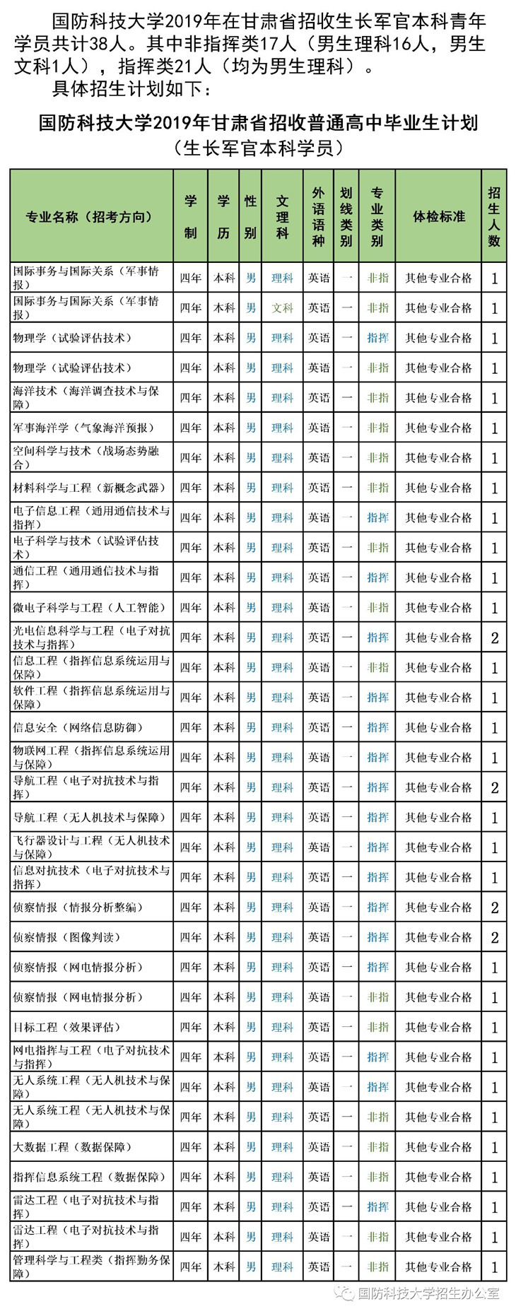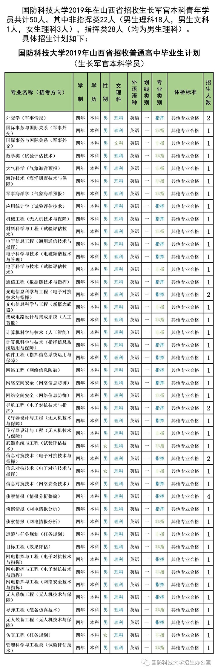 国防科技大学2019年招收普通高中毕业生计划(生长军官本科学员)