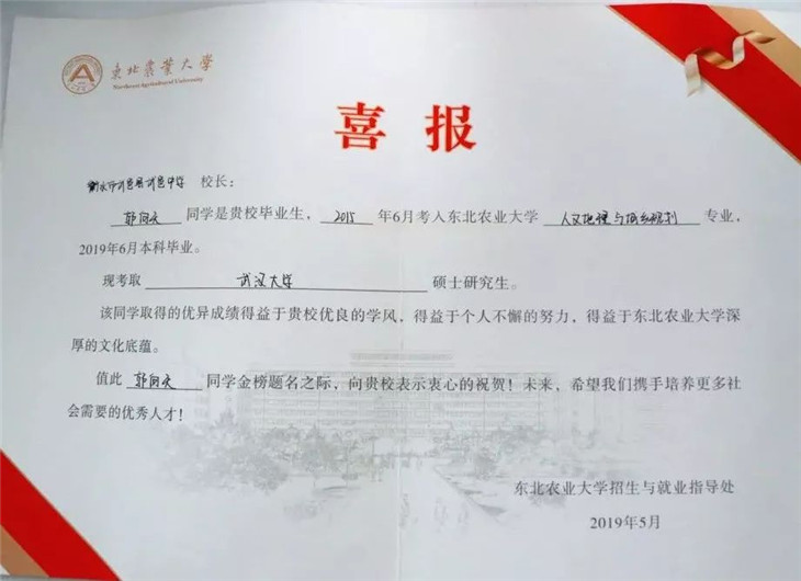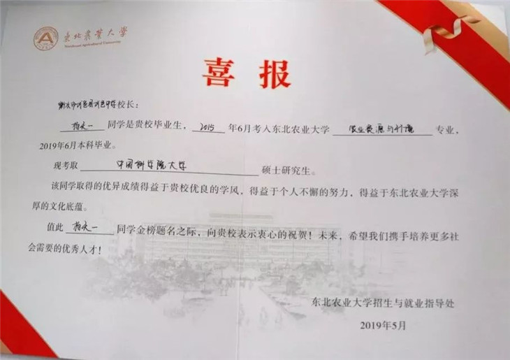近日,东北农业大学向我校发来喜报,我校郭向天和杨天一两位同学,在东北农业大学学习期间继承母校得优良传统,努力学习、刻苦奋斗,分别考取了武汉大学和中国科学院大学的硕士研究生。