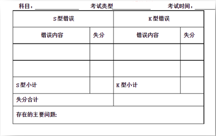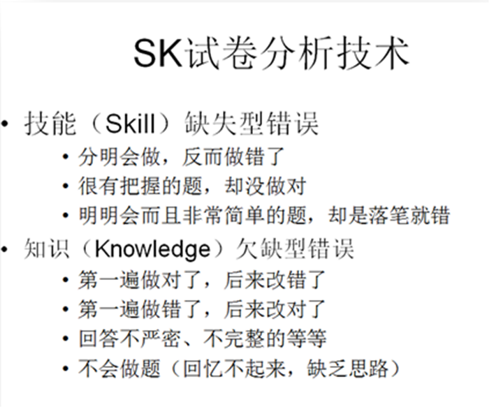 为了让学生们从期中考试中认真找出自己的得与失,班主任利用SK试卷分析技术帮助学生们找差距、找不足,Skill(技能)型错误、Knowledge(知识)欠缺型错误,将错误细化,针对不同问题,采取不同办法,帮助学生提高个人成绩。