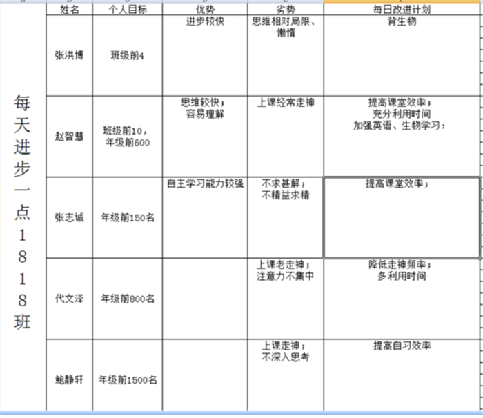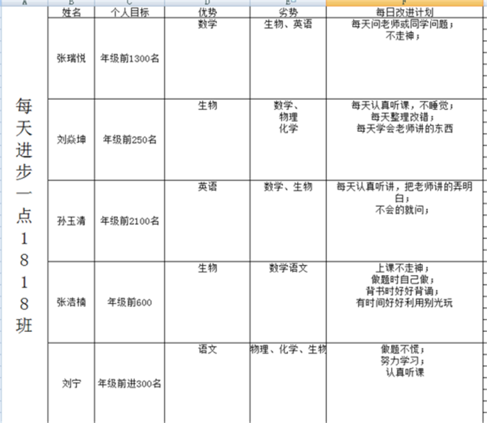 有这样的一些同学,他们勤学苦练,奋勇拼搏,不断向更高的目标发起冲击。他们积累着点点滴滴的收获,堆积成自信的高峰;他们攻克这一道那一道难题,收获成功的喜悦。面对学习,他们有着锲而不舍的执着,有着精益求精的追求!他们就是高二18班的进步之星。
