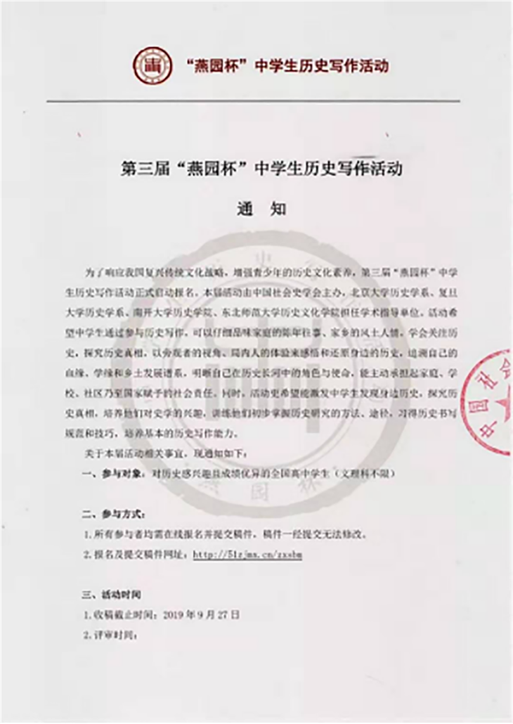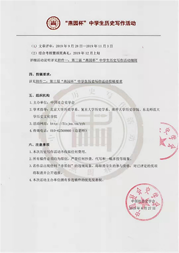 为了响应我国复兴传统文化战略,增强青少年的历史文化素养,第三界“燕园杯”中学生历史写作活动于2019年9-12月如期进行。本次活动由中国社会史学会主办,北京大学历史系、复旦大学历史系、南开大学历史系、东北师范大学历史文化学院担任学术指导。让同学们仔细品味家庭的陈年往事、家乡的风土人情,学会关注历史,探究历史真相,培养学生对历史的兴趣,训练他们初步掌握历史研究的方法、途径,习得历史书写规范和技巧,培养基本的历史写作能力。