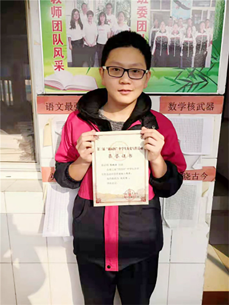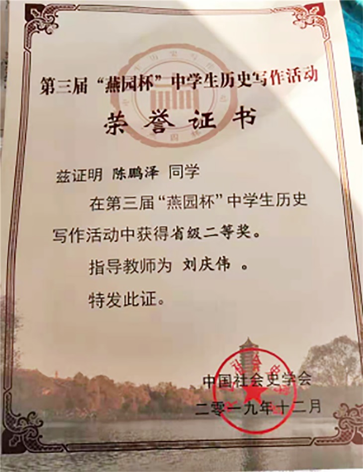陈鹏泽同学在“燕园杯”学生历史写作省级大赛中获奖