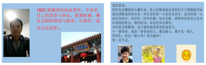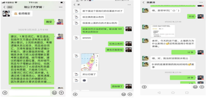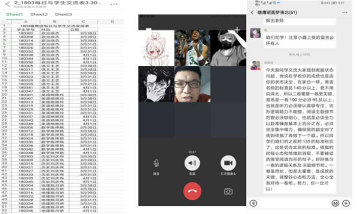 孩子们在家学习,舒适的环境难免让他们有懈怠心理;网络授课互动少,也难免会出现烦躁、焦虑等情况。因此做好学习督促,注意心理疏导,加强师生沟通,增强师生互信就显得尤其重要。老师们必须随时掌握孩子的学习情况,解决他们的学习困惑,排解他们的学习焦虑,树立他们学习的信心,鼓舞他们学习的士气。只有这样孩子们的心情才会好,学习效率才会高。因此这个团队坚持每位老师每天与3名同学微信电话,拉近师生关系,有针对性地进行学习方法指导,答疑解惑和进行心理疏导,并进行励志教育。定期跟部分家长通电话,加强交流,共同努力,为孩子营造和谐奋进的家校氛围。事实证明,这项举措及时有效地督促了学生的学习,提高了学习效率。