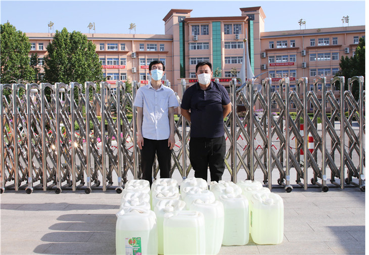 5月28日,社会爱心人士赵旭先生为我校捐赠84消毒液40桶,金耀辉副校长代表学校接受了捐赠,并对赵先生的无偿捐赠表示衷心的感谢。