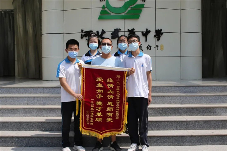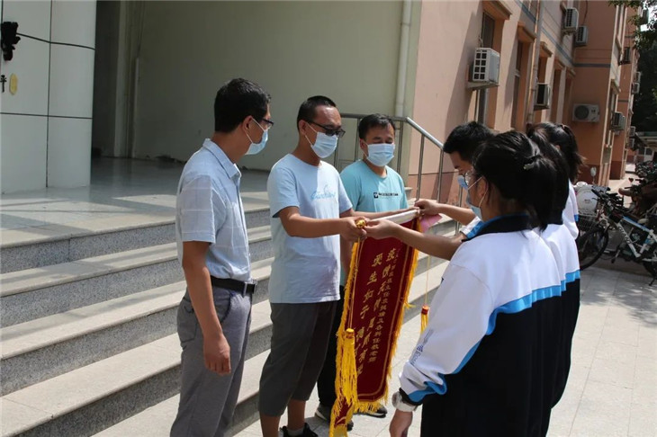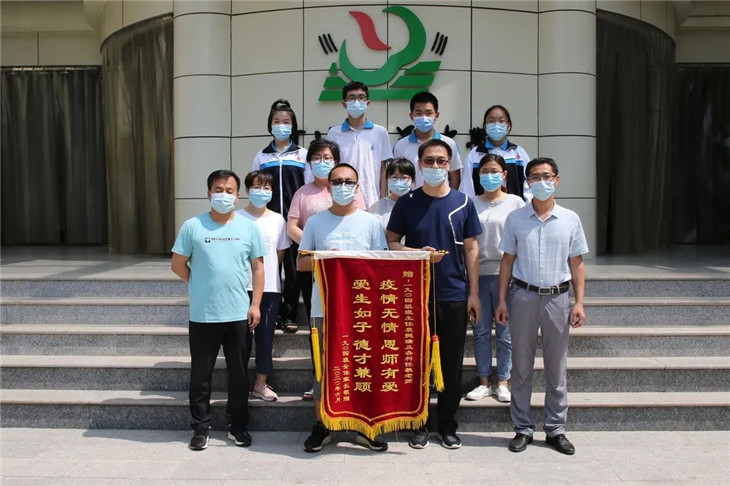 6月20日上午,我校高一年级1904班全体家长为班主任袁挺瑞老师及1904班的全体老师送来了一面绣有“疫情无情,恩师有爱,爱生如子,德才兼顾”的锦旗,家长们受疫情影响无法到校,于是将锦旗邮寄到学校,由1904班的李东奥同学代表各位家长向老师赠送锦旗,我校高一年级主任贾新亮、级部主任袁占军、班主任袁挺瑞及1904班任课老师在教学楼前接受了这面锦旗。
