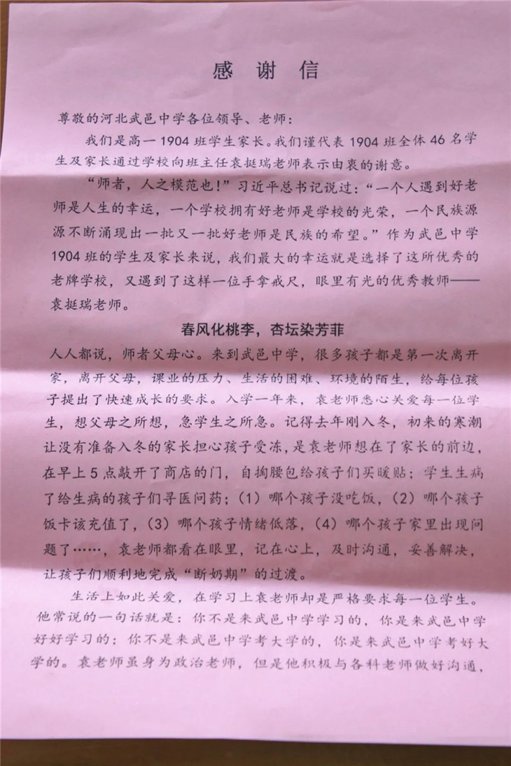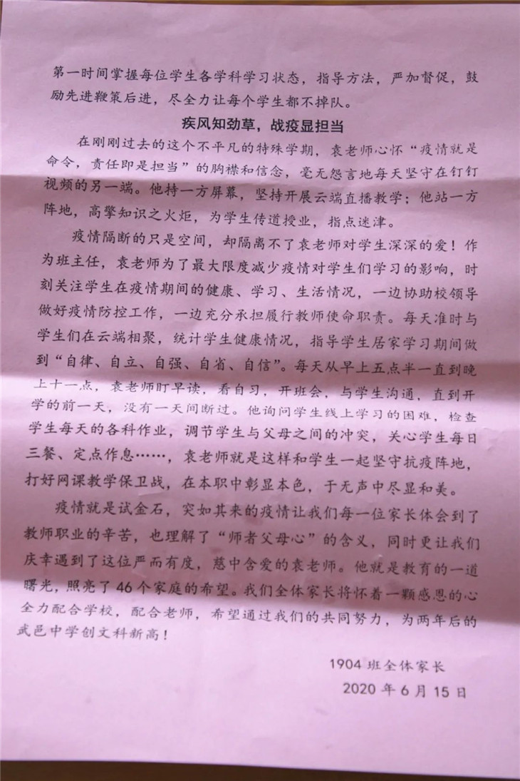 除此之外,家长们还向袁挺瑞老师寄来一封书信,信中饱含他们对袁老师敬业无私,爱生如子的感激之情。
