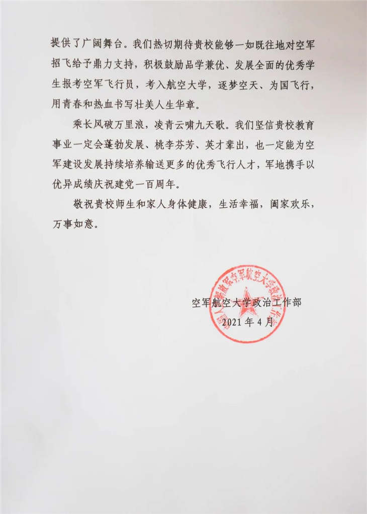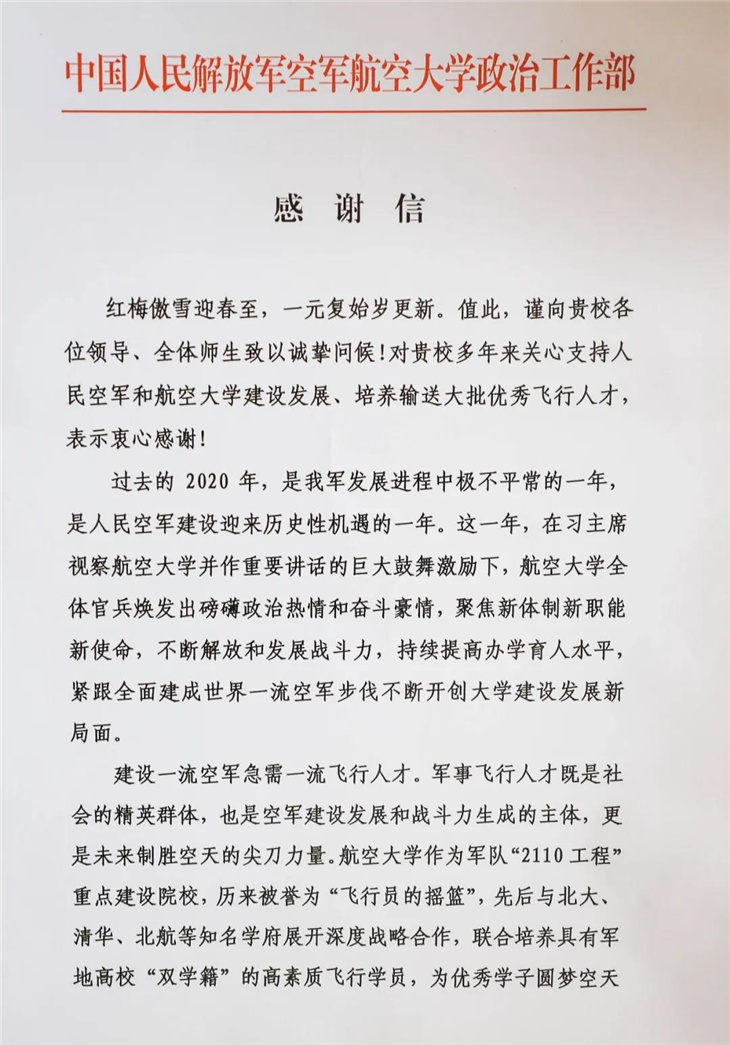为党育人 为国育才——中国人民解放军空军航空大学向我校发来感谢信
