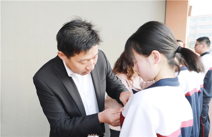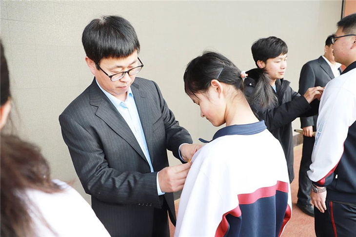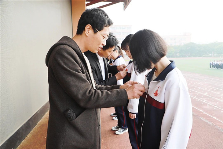 活动首先是由高一年级四位护旗手请出团旗,我校领导为部分团员佩戴团徽,小小的团徽不仅是团员的象征,更代表了责任,这意味着学生们成为了广大青年的代表,成为了实现中华民族伟大复兴的主力军。