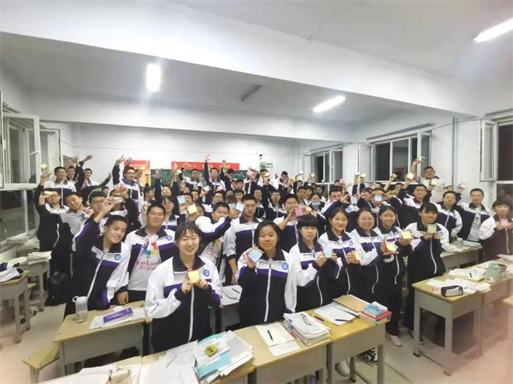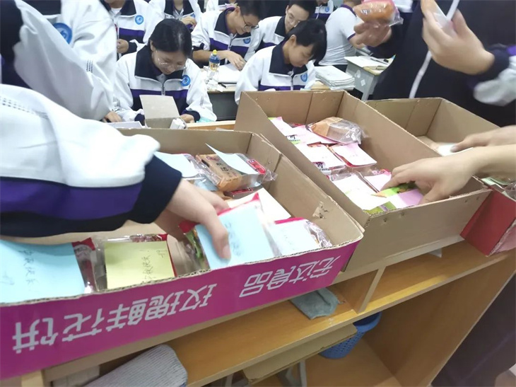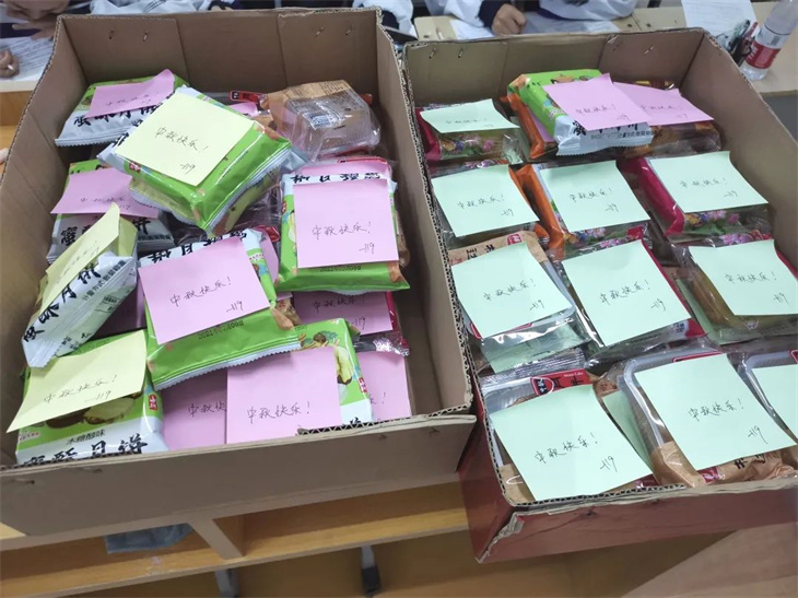在中秋主题班会时,班主任老师将早已经准备好的月饼摆到讲台上的时候,同学们瞬间沸腾了。每个同学都用期待的眼神望着桌子上包装精美的月饼。很快,老师将月饼分发下去,同学们的脸上出现了幸福的笑容,大家纷纷在镜头前显摆着自己的中秋福利,老师也与他们合影留念,这时,他们真切地感受到,武邑中学,就是他们共同的家。