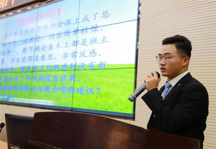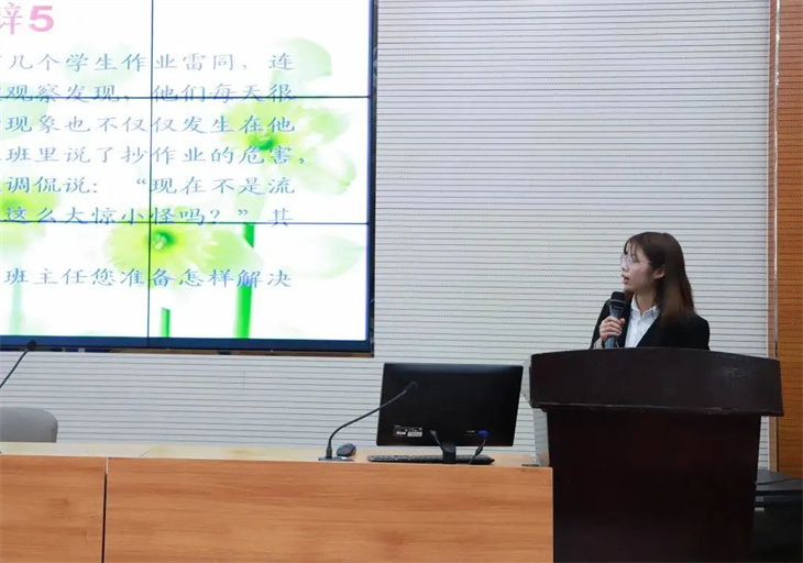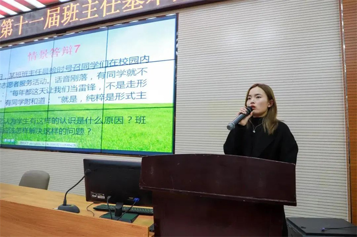 下面是最考验老师们的临场反应能力和处理学生问题的能力情景答辩环节,老师们现场抽题,即兴答辩。很显然我们所设计的情节并没有难倒才思敏捷的班主任老师们,他们在经过短暂的准备之后都针对自己所抽到的问题给出了十分合理的解决方案。