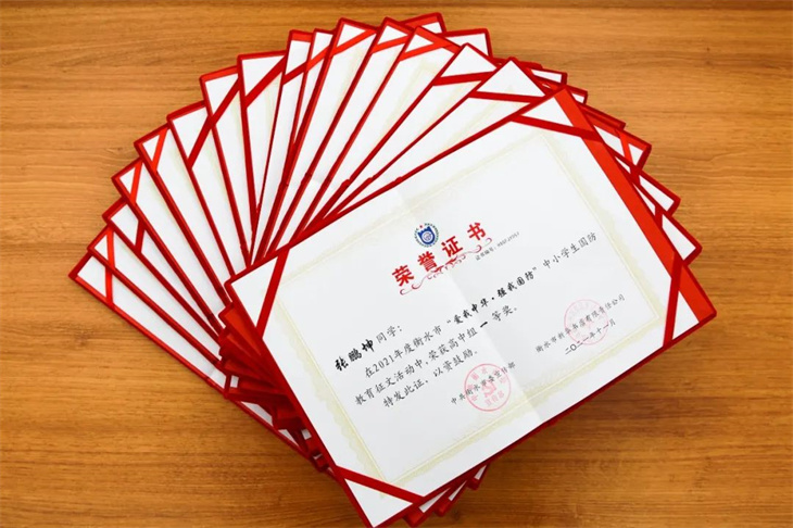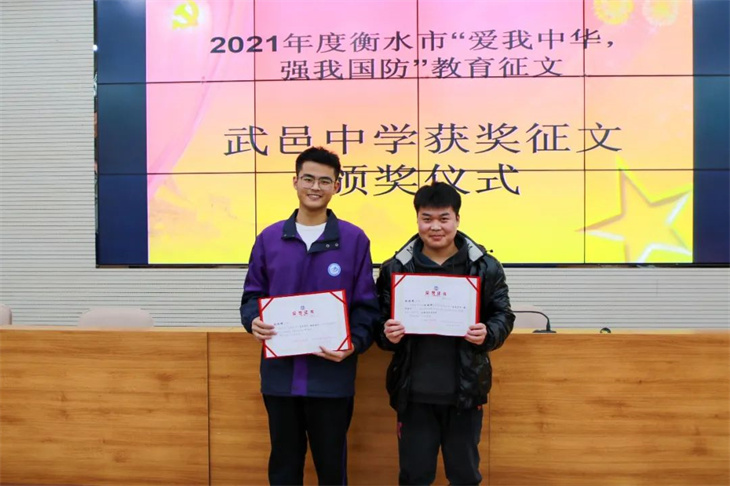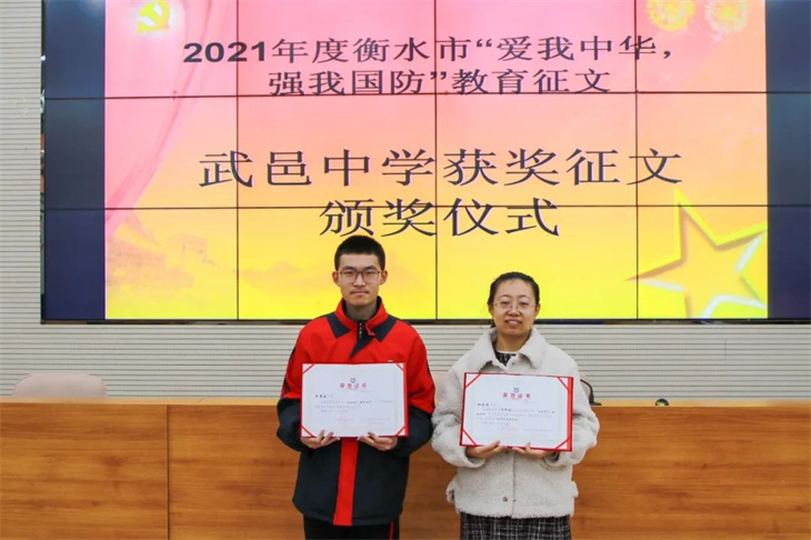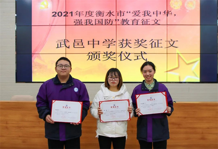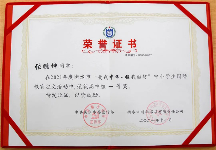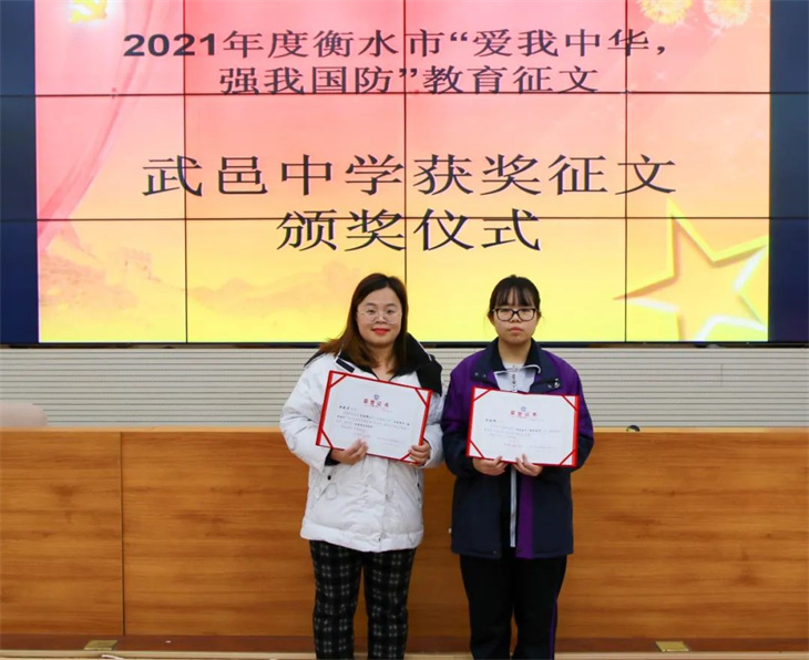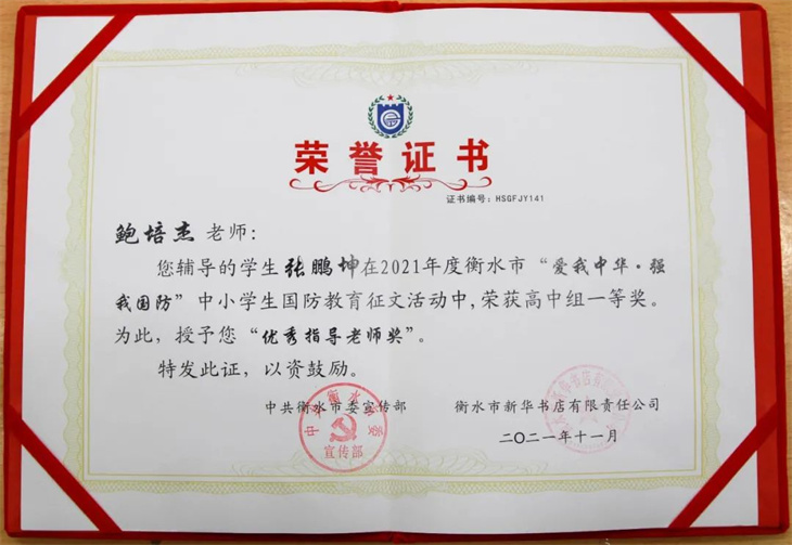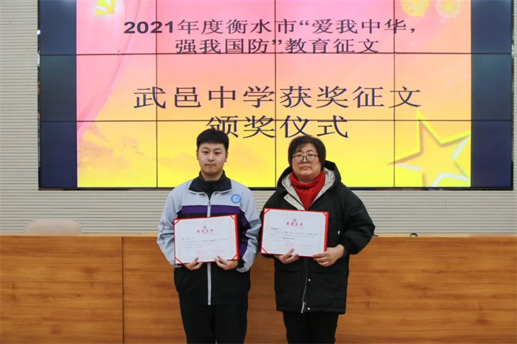 捷报连连,喜报频传。日前,衡水市委宣传部公布了“2021年度衡水市‘爱我中华·强我国防’中小学生国防教育征文活动”获奖名单,我校8名学子分别斩获一等奖、三等奖和优秀奖,7位老师获得“优秀指导老师奖”。特发喜报,热烈祝贺!