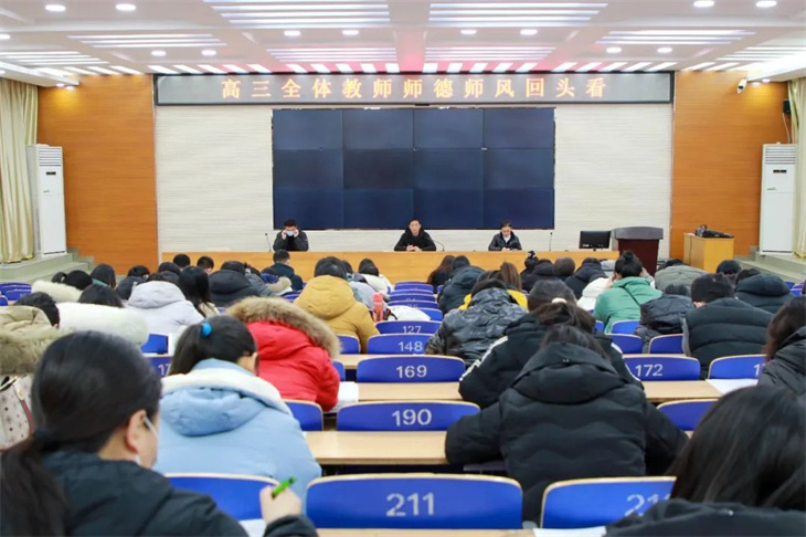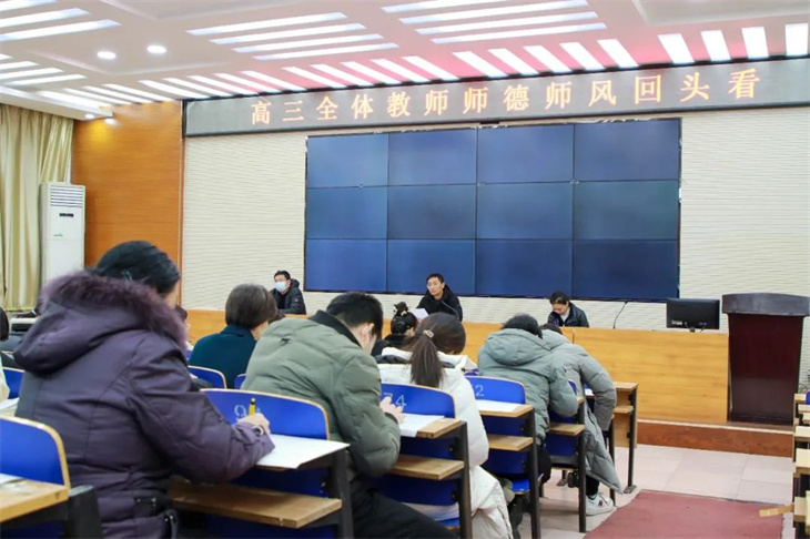 学高为师,身正为范。为进一步强化我校师德师风建设,提高教师师德师风修养,规范教师教育教学行为,12月18日,我校高三年级于科学馆报告厅举行了“高三全体教师师德师风回头看”活动。高三年级主任贾新亮,级部主任袁胜利、闫鹏及高三年级全体教师参加了此次会议。