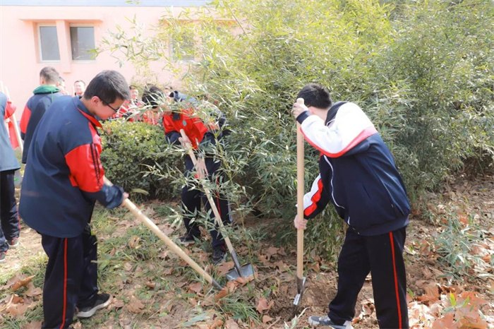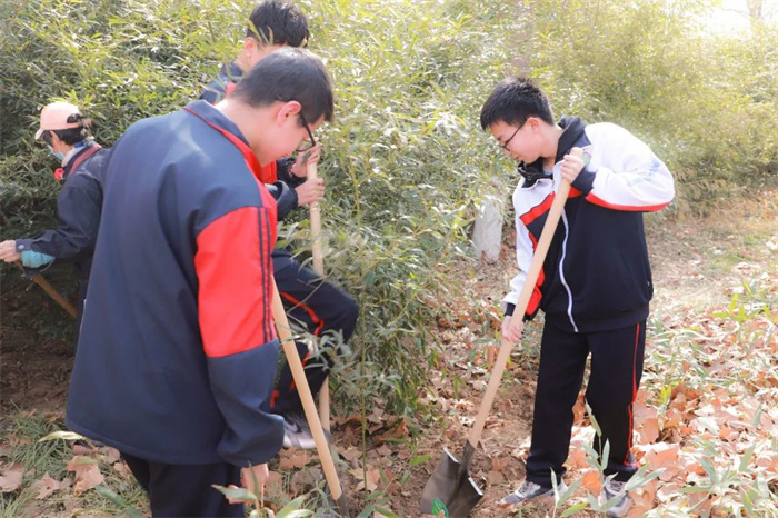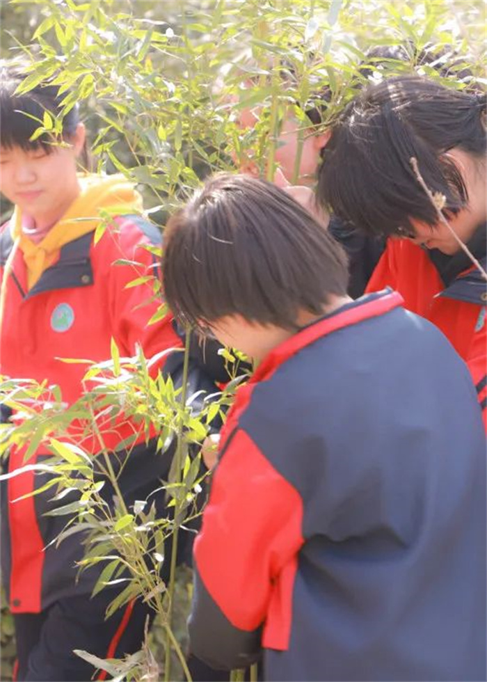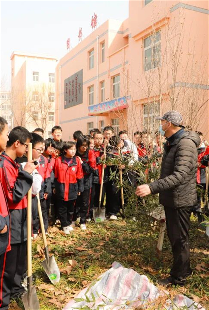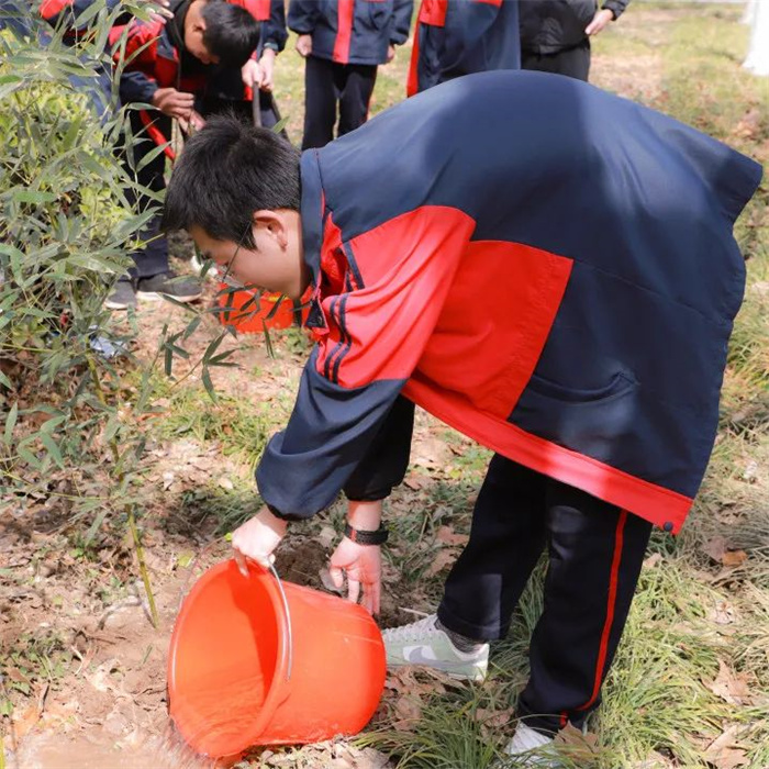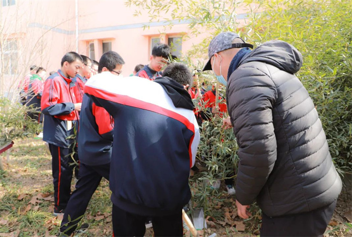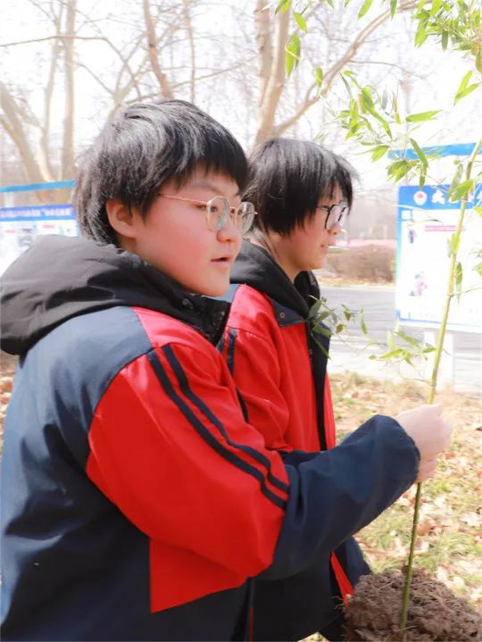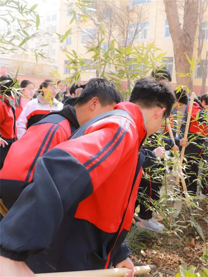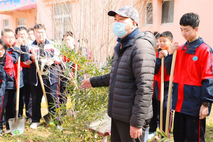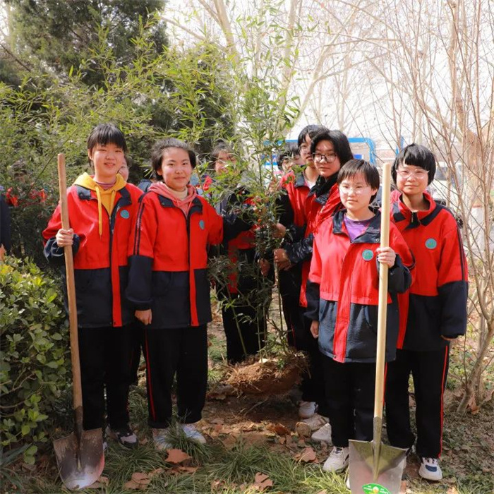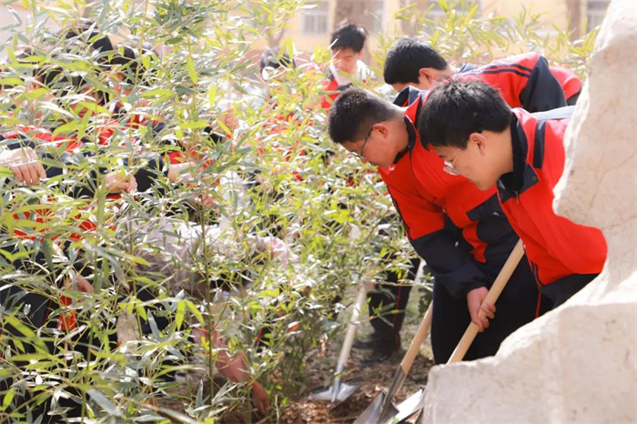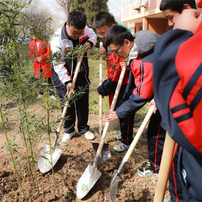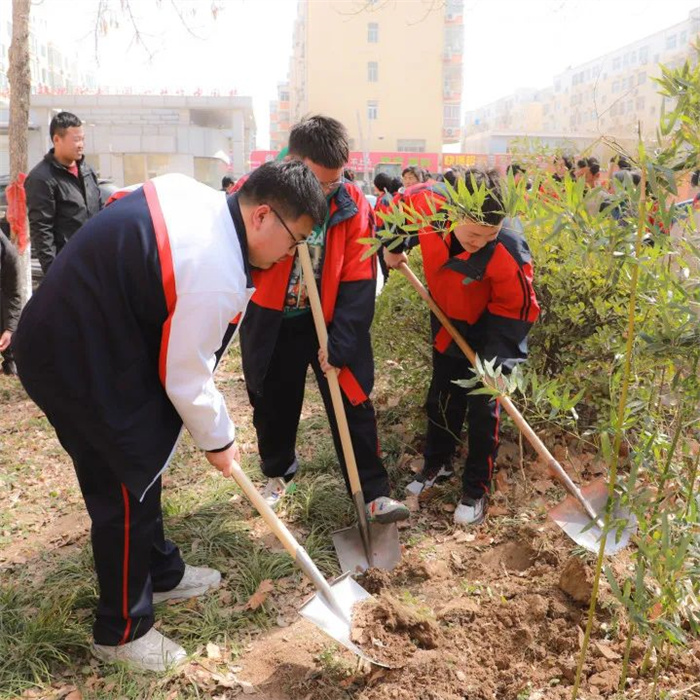 春回大地,正是植树好时节,相约美好春天,走近大自然。教师和同学们携带铁铲、水桶等工具开始植树。同学们怀着兴奋地心情来到指定植树区域,你挖坑,我埋土,他浇水。同学们分工明确,整个植树现场大家互帮互助,气氛活跃。