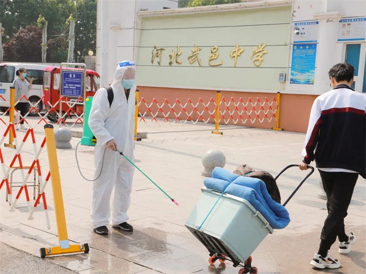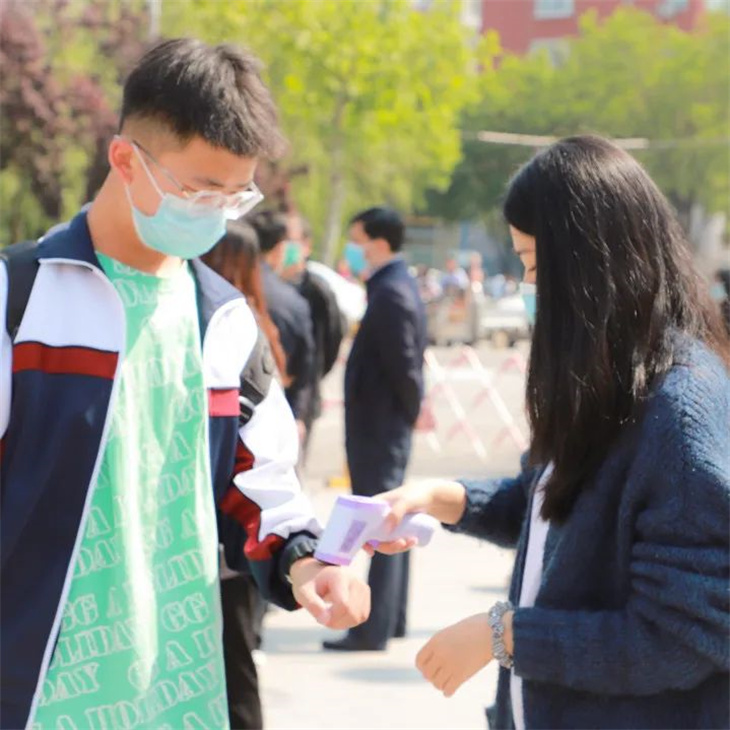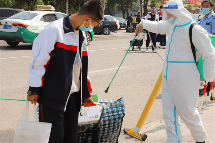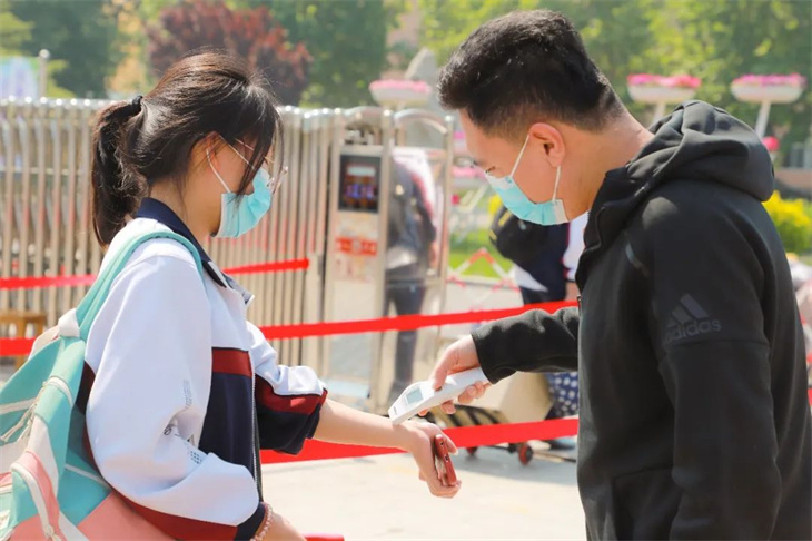 上午,学生和家长陆续走到校门口,排队从专门进校通道进行消毒和体温测量。学校严格把控入校测温第一关,所有学生自觉佩戴口罩,间隔至少一米,通过体温检测后,学生有序进入校园。