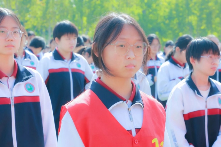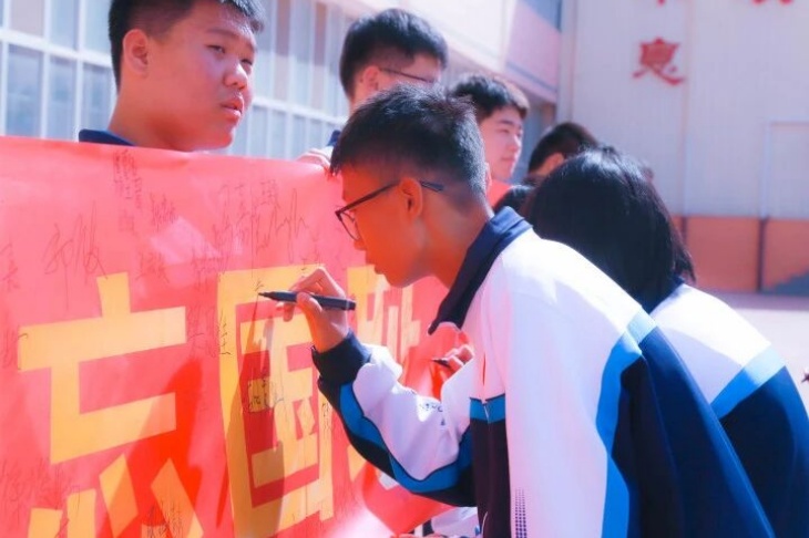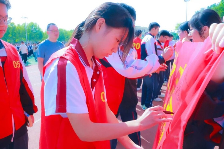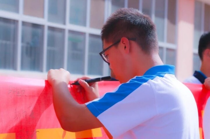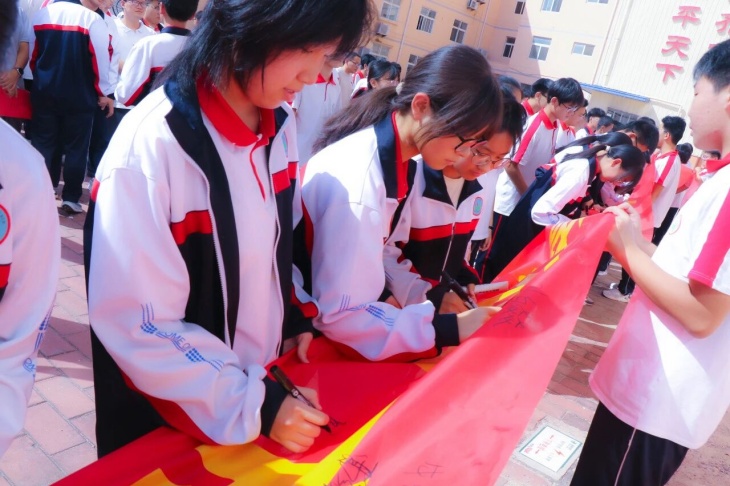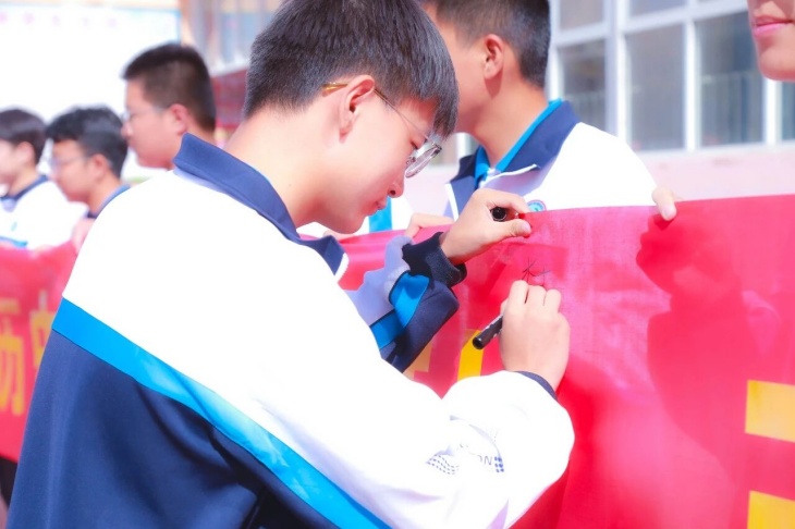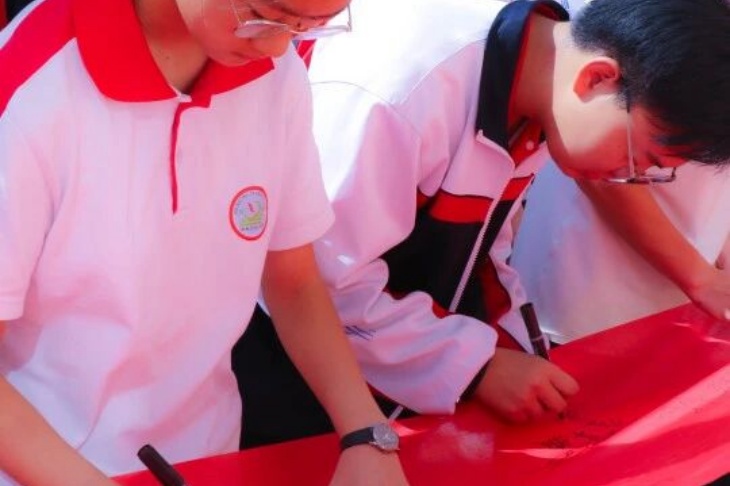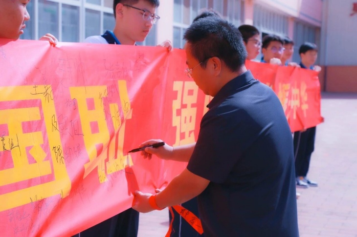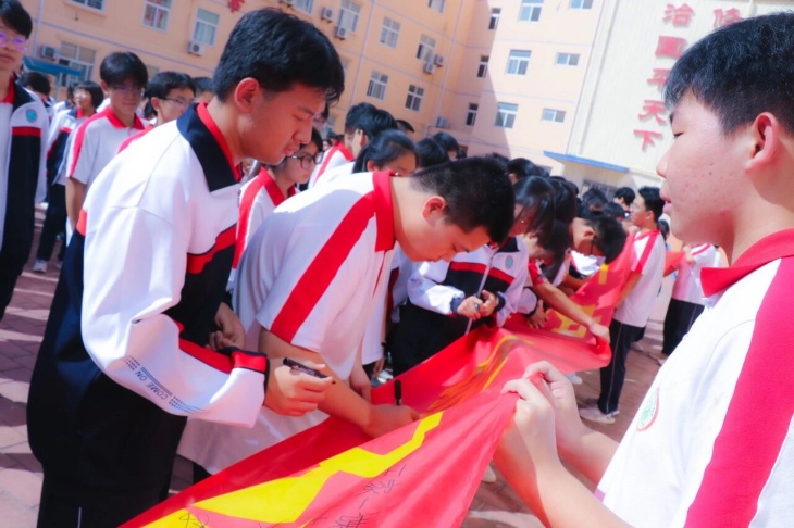 学生们身着整齐的校服,肃然列队,庄严宣读誓词。他们誓言为国家的独立和民族的尊严不懈奋斗,决不向侵略者低头。这一宣誓仪式,不仅象征着武中学生的团结与坚定,更彰显了他们对祖国和民族的无限热爱与忠诚。当师生们肃穆地站在条幅前,郑重地签下自己的名字时,整个会场都沉浸在一种庄严肃穆的氛围中。家仇国恨,深埋心底,无法言表,但那份坚定却写在了每一个人的脸上。今日,他们努力学习;未来,他们必将矢志报国,吾辈自强!