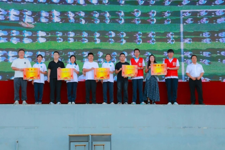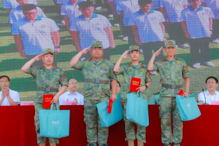 最令人心潮澎湃、倍感荣耀的,当属激动人心的颁奖环节!我校领导分别为军训宿舍内务整理优秀班集体、军训成果考核优秀班集体、军训优秀教官颁发奖品奖状。