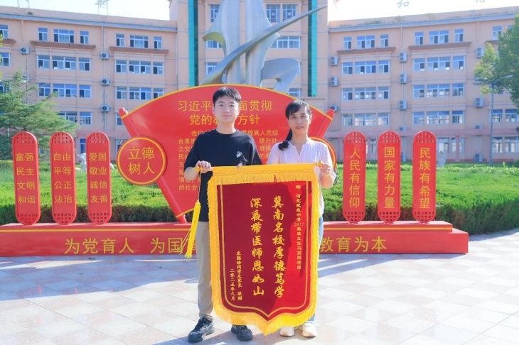 “师者,所以传道授业解惑也。”然而,在武邑中学,老师的角色远不止于此。对于2417班的班主任马高阳老师而言,守护每一位学生的安全与健康,是他肩上最沉甸甸的责任。不久前,宋懿晗同学因不慎食用坚果,突发严重过敏反应。情况危急,学生的安危牵动着所有人的心。在这千钧一发的时刻,马高阳老师没有丝毫犹豫,他沉着冷静,第一时间做出判断,迅速将宋同学送往医院。从联系家长、办理手续到全程陪护,他忙前忙后,用最迅速的行动和最温暖的陪伴,为学生争取到了最宝贵的救治时间。当看到宋同学转危为安,马老师悬着的心才终于放下。一面写有“冀南名校厚德笃学 深夜带医师恩如山”的锦旗,是家长最真挚的感谢,也是对马老师临危不乱、爱生如子精神的最高褒奖。